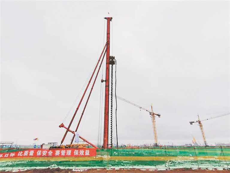 施工单位中冶建设高新工程技术有限责任公司该项目总工程师陈彦坤告诉记者:“长螺旋钻机高20多米,由工人分两班24小时不停打孔作业,打孔需向地下钻15米深度。每天大约能完成50个,像宿舍楼桩基施工需完成打孔150个,大约三天就可以完成桩基部分的打孔、放置钢筋笼、浇筑混凝土等工作。目前,宿舍楼区域已完成桩基施工的九成工作。”