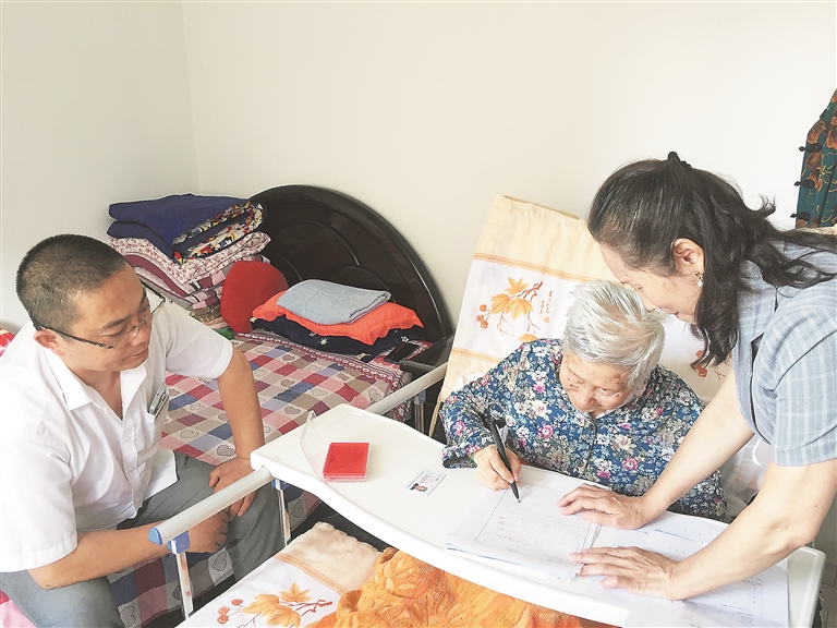 工作人员到因病卧床的张明艳家中,为其办理房屋买卖手续。