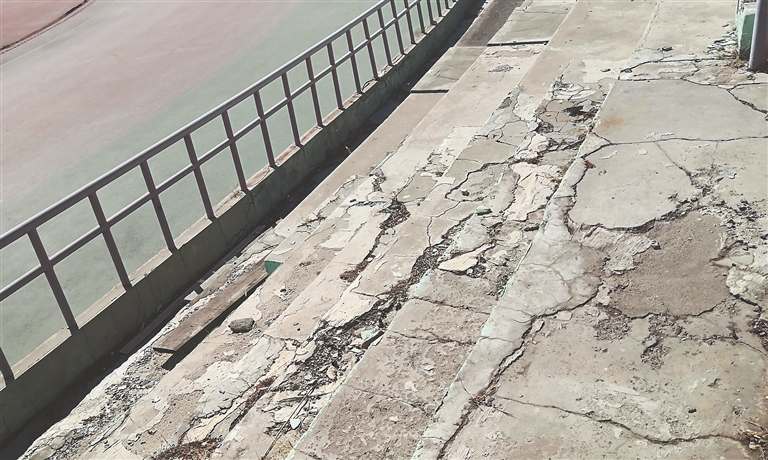 近日,记者来到当地走访了解情况。附近居民说,这处体育场定时向市民开放,许多人经常来到这里锻炼身体。体育场周边的几个入口处栏杆破损,场地中间的环形跑道出现了不同程度的破损,看台上的阶梯式的水泥“座位”也是大量开裂,脱落。由于漏水,一些位置重新铺设了防水材料,呈现出黑色。据了解,这处体育场建于三四十年前,目前相关部门已将其列入维修计划,今年启动维修工程。