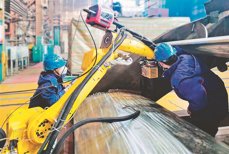 发电设备大型关键部件机器人焊接技术应用现场。本报记者 薛婧 李爱民摄