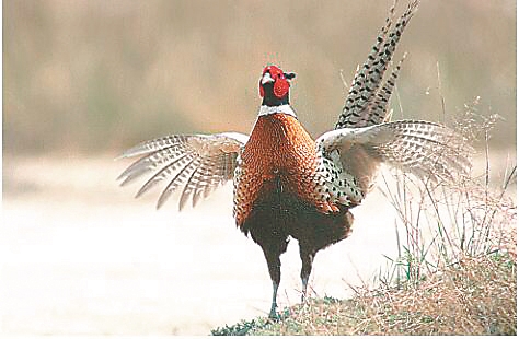 一只雉鸡在杜尔伯特连环湖畔沐浴春光。