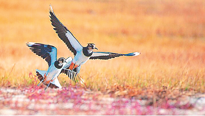 喇嘛甸湿地两只凤头麦鸡比翼齐飞。