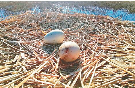 日前,两只丹顶鹤静卧在林甸育苇厂芦苇荡内,一个多小时后,丹顶鹤外出“兜风”。记者通过航拍器发现,一个丹顶鹤窝里有两枚大大的鹤蛋!