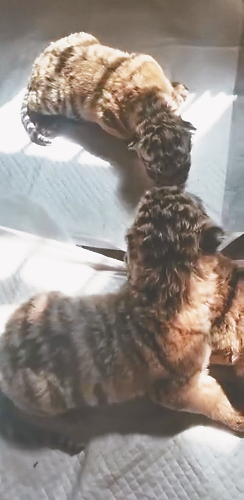 海林市横道河子东北虎开发有限公司总经理刘长海介绍,这里每年大概有近30只虎宝降生,这3只东北虎宝宝是在4月21日早上诞生的,它们是虎爸虎妈自然孕育。由于虎妈妈是初产,没有带娃经验,三只小母虎目前由饲养员妈妈来照料。