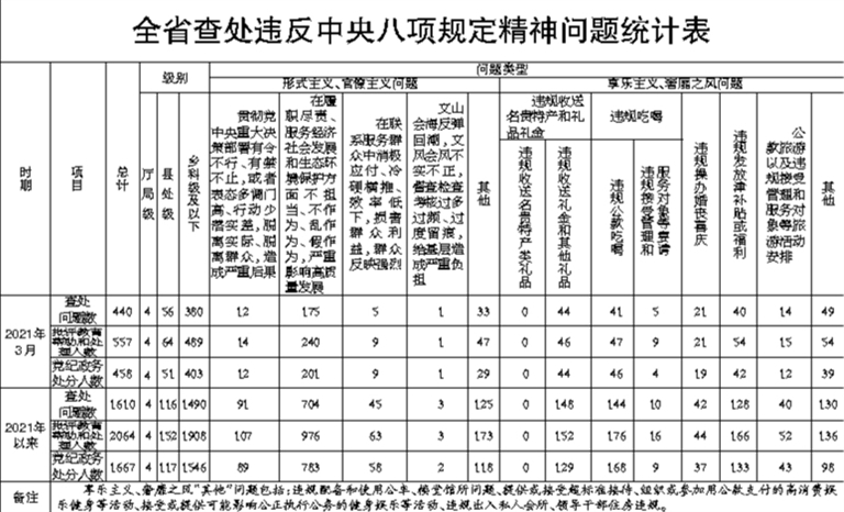 本报讯(盛季轩 记者薛立伟)2021年3月,全省各级纪检监察机关共查处违反中央八项规定精神问题440起,批评教育帮助和处理557人,其中党纪政务处分458人。
