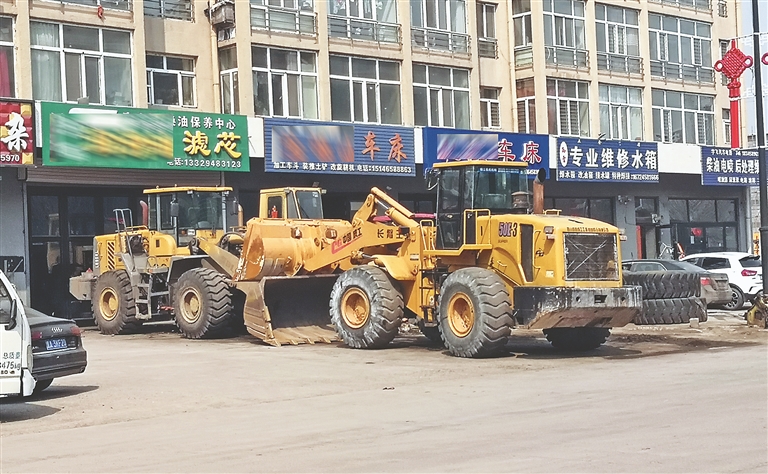 近日,记者在铁力市五一街附近看到,道路两侧开了十几个汽车修配厂,大量的卡车、铲车挤占在道路上进行维修,行人只能在机动车道上通行。