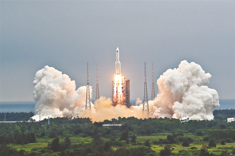 4月29日11时23分,中国空间站天和核心舱在我国文昌航天发射场发射升空,准确进入预定轨道,任务取得成功。新华社记者 琚振华摄