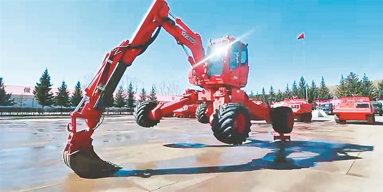 在大兴安岭森防支队三中队训练场上,一台造型奇特、长着“长腿”的“庞然大物”吸引了记者的目光。这是ET111步履式挖掘机,被称为“钢铁蜘蛛侠”,其铰接式机械腿可做高自由度步行运动,液压独立驱动轮胎前后自由转向,是在陡峭的山坡、水网、沼泽地带可以自如作业的全地形多用途挖掘机,在火场迅速开设隔离带,控制火势蔓延。