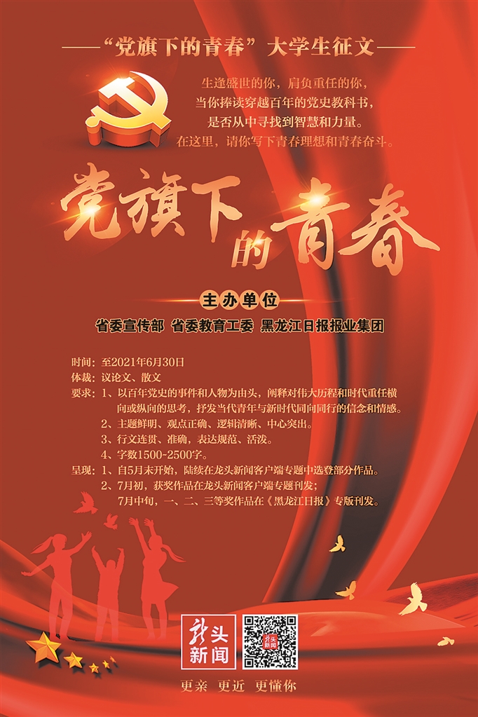 此次活动围绕庆祝中国共产党成立100周年这一重大主题,以百年党史的事件和人物为由头,抒发当代青年与新时代同向同行的信念和情感。参加征文的同学下载黑龙江日报“龙头新闻”客户端即可投稿。