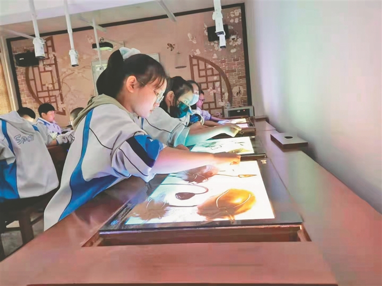 沙画课堂上,学生自己动手创作沙画,提高想象力、创造力同时,对散文《荷塘月色》有了更深刻的理解和感悟;非遗体验印章课上,34名初一学生在老师指导下,学习用工具在木块上篆刻,了解中国传统文化,体会非物质文化遗产的魅力;科技创客智慧教室内,学生正在以轻粘土为原料,配回力车底座,用废旧矿泉水瓶做车身,开动脑力和手力拼装,一场“谁的小车跑得快”对决即将开战;皮艺课堂上,几组同学正在穿针引线,学做钥匙包……
