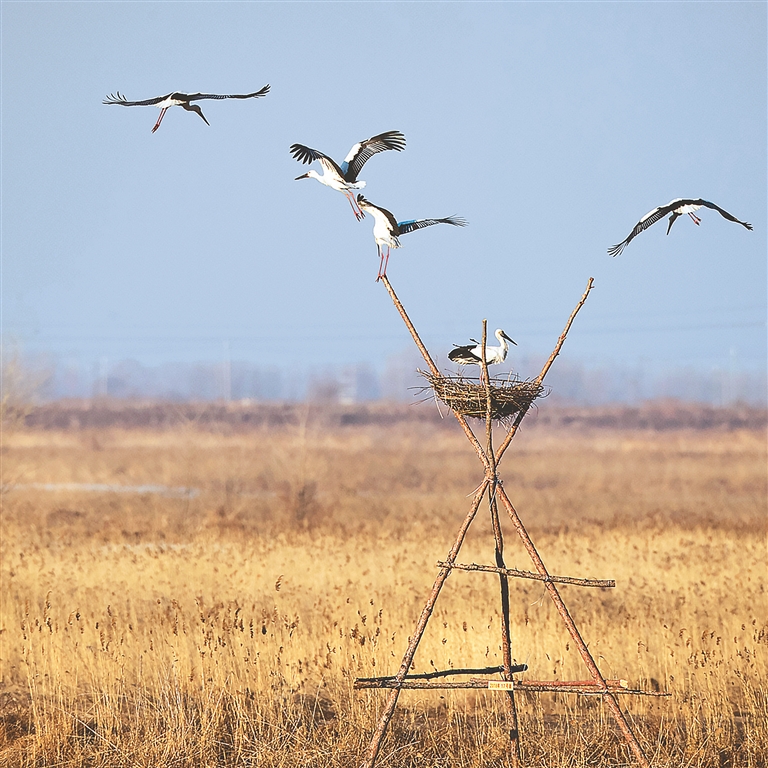 2019年,又成功招引10对东方白鹳在区内筑巢,并成功繁育,当年回迁东方白鹳多达230余只,向驻留又迈进了一步。东方白鹳属于大型涉禽,由于它对栖息地生态环境要求极为苛刻,全球仅存约4000只,同步实现繁育和驻留,意义非凡。2020年又增加20个鸟巢,三年共计建鸟巢40个,成功招引30对孵化,总计孵化幼鸟约110只。