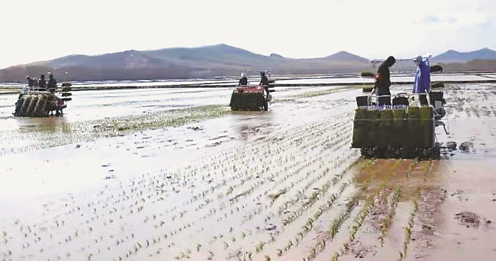 高性能变量施肥、侧深施肥插秧机正在进行水田插秧作业。娄程程 黑龙江日报全媒体记者 吴树江摄