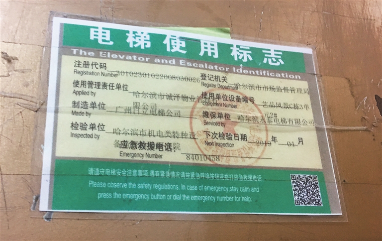 12日,记者来到现场采访,看到电梯里贴的使用标志。上面显示,检验日期至2019年4月,使用管理责任单位为哈尔滨市诚泽物业,维保单位是哈尔滨永泰电梯有限公司。
