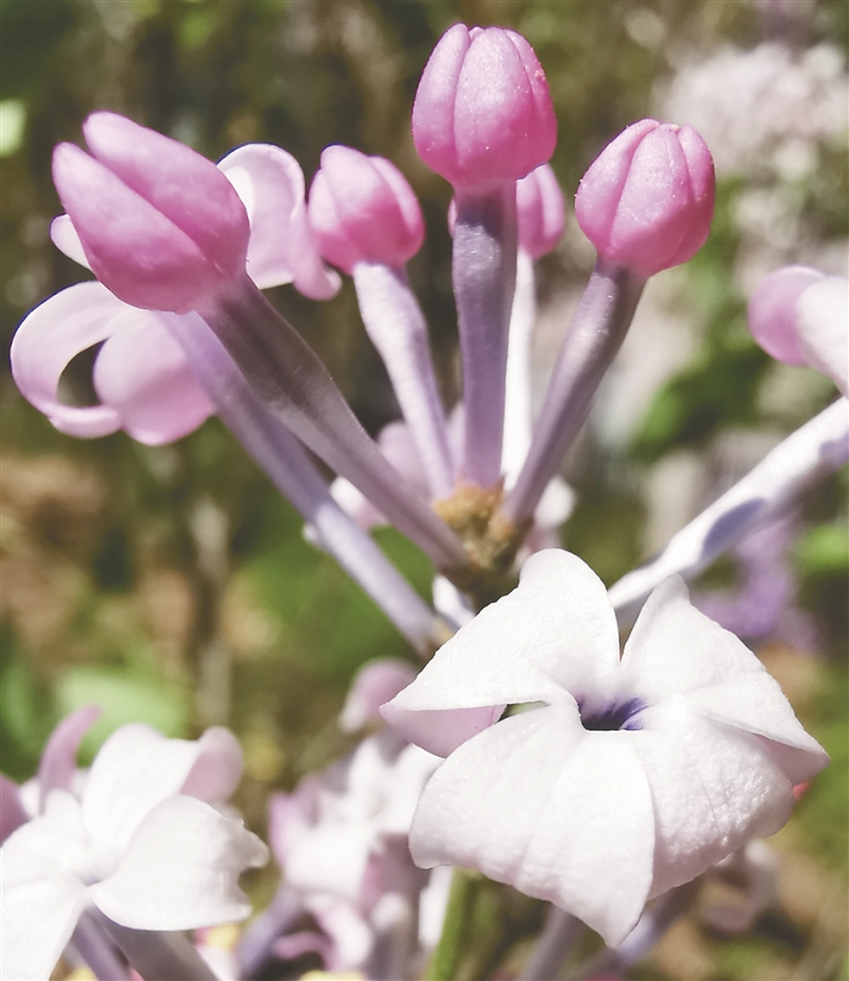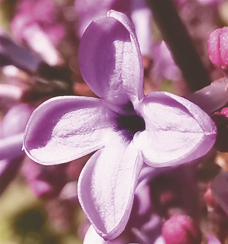 在这丁香丛中,我更喜欢的还是那藕荷色的丁香花。我愿意看它的那身颜色,色深若紫,色浅若粉,紫粉相间,一显优雅。它那喇叭口似的花瓣就像牵牛花,昂首向天怒放,韵如花仙子,亦真亦幻,柔和,温情,淡定而不张扬,清秀而雅。