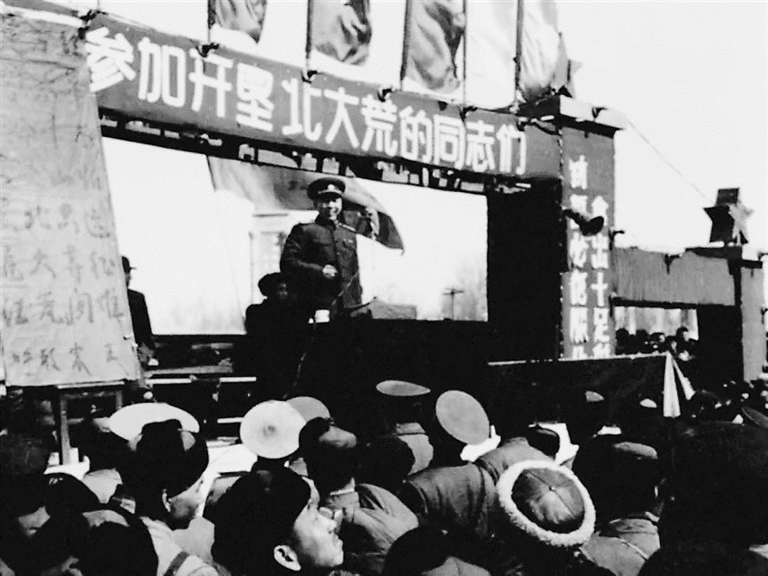 王震将军身着军装,肩上佩戴着三颗金星的上将军衔,披着一件黄呢大衣,在农垦局长的陪同下,走上主席台。站稳后,他把大衣脱掉,向会场上的人群频频招手。这时,一阵掌声响了起来。王震将军对着话筒,用浓重的湖南口音,作了题为《向捍卫祖国建设祖国的战士致敬》的讲话。他说:“欢迎同志们到北大荒来!我代表人民解放军总部,代表农垦部所属全国农牧场50万职工,向同志们表示慰问和欢迎……大家来开垦北大荒,这个任务是非常艰苦的……在这里盘踞的日本帝国主义者,被消灭了,日本强盗蒋介石匪徒,都被我们消灭了。在这没有人烟的地方,我们盖了房子开了荒。能完成艰苦任务,就能得到光荣,英雄的人民解放军是能战胜艰苦困难的……”说到这里,将军把话题一转:“你们都是当过排长、连长,也有当营长的,我也当过排、连、营长。同志们,在战场大冲锋,排、连、营长是在部队前头呢,还是跟在后面呢?”大家回答:“在前面!”“那么开垦北大荒呢?”王震又问大家。大家回答:“也该在前面!”“遇到艰苦困难怕不怕?”“不怕!”“苦战三年行不行?”“行!”