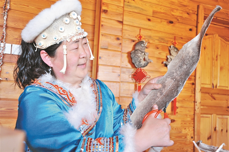 “共产党啊额么赫尼,俄里板丢俄里爱依……”一曲欢快的赫哲族歌曲从村里的传习所传出来,这里是村民吴桂凤的教学地。这几年,吴桂凤一心扑在民族文化传承教学上。在吴桂凤的带领下,尤明芬、尤俊艳、尤俊宏等15名赫哲村民深入研究“伊玛堪”说唱技艺,创作了多部文艺作品,并通过微信视频广泛传授。一首《乌苏里芒目》唱罢,吴桂凤爽朗直言:“听起赫哲族歌曲谁都坐不住,都得手舞足蹈起来,这就是我们民族文化的魅力。”