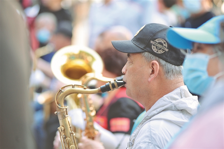 那边,一个音箱、一个话筒,发烧友们轮流献唱,不时地博得围观人群的阵阵掌声。一些市民拿出手机拍下视频,发到朋友圈。这边,十几个人组成了小乐队,有吹的、有拉的、有弹的,配合着合唱团一起表演。“没有共产党就没有新中国”、“红梅赞”等一首首经典歌曲的旋律久久在江畔回荡。
