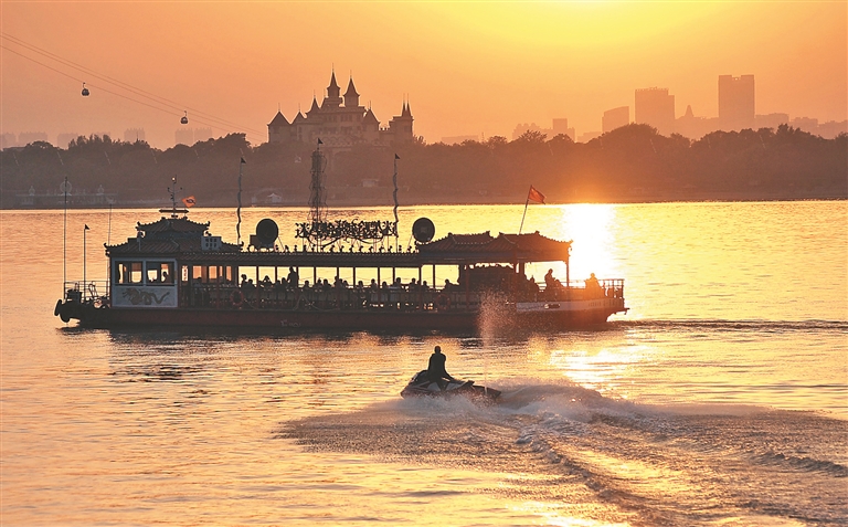 傍晚,哈尔滨市松花江面上,市民和游客们乘坐游船游览两岸风光。夕阳余晖中,几条摩托艇来回穿梭,构成了一幅美丽的图画。岸边,斯大林公园市民和游客悠闲地散步游玩。享受着哈尔滨夏日的清凉,观赏迷人的江景,欣赏精彩的文艺演出。记者看到,从九站至防洪纪念塔间不到一公里的范围内分布着十几个大小不等的“演出团体”,为人们献上各具特色的歌舞节目。