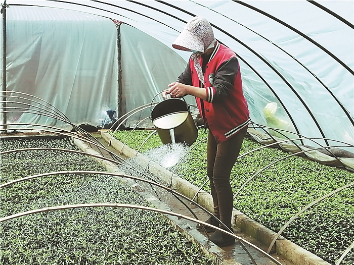 村民在温室大棚中精心侍弄秧苗。