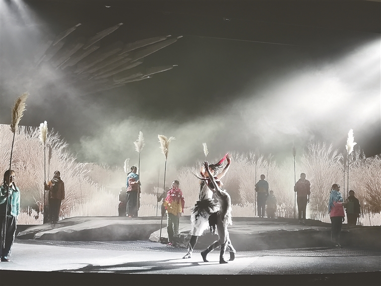 《湿地深处》的舞美设计,从民间的提线木偶中获得灵感,用了两组机械装置,组成一双环抱的手,又像一双翅膀。手与翅相互缠绕,通过转台大开大合,空间如同打开的百宝箱,一会儿是傍晚喧闹的场院、一会儿是温暖的炕头、一会儿是芦苇荡漾的湿地……最终在狂舞的巨幅纱巾中,猛地吹荡起晶莹的雪片,向观众飞舞。
