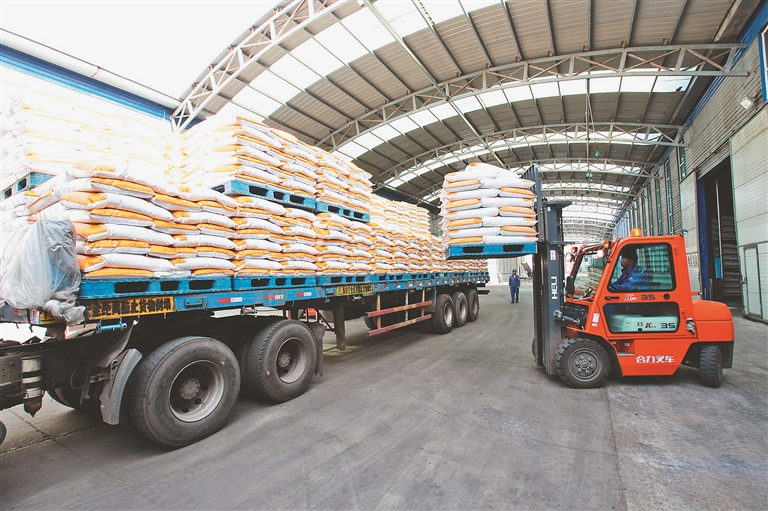 龙江阜丰产品生产下线,立即被大型运输车辆运往港口装船出口。 黑龙江日报全媒体记者 姚建平摄