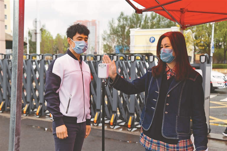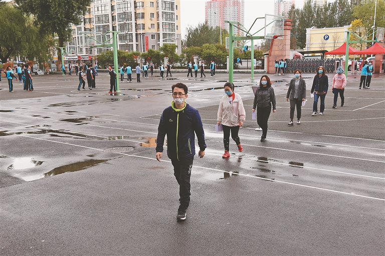 近日,哈尔滨市第四十九中学进行了高考实战演练。上图为进行体温检测。下图为站队等候入场。