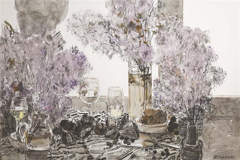 “丁香花,是哈尔滨的市花。全世界的丁香有60多种,而哈尔滨就有40多种。它清新淡雅,契合水彩画的气质,从点线面抽象的笔墨层面看也切合我对艺术的理解,能够把我的强项表现出来,能够尽情挥洒中国文人画书写的能力。所以近几年我一直在创作这个系列,一直在从中探索新理念,新风格。”赵云龙说。