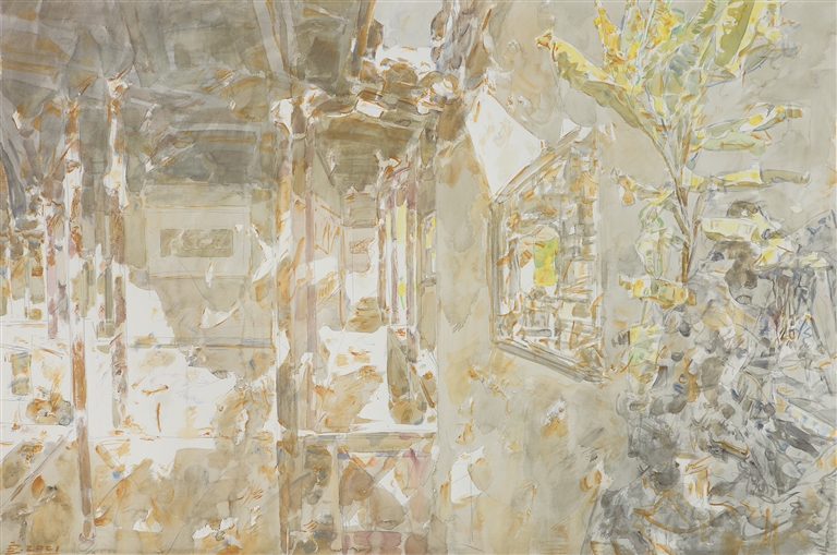 不再拘泥于学院式的再现规范,也没有盲从前卫风格对画面的构建,赵云龙从个体经验出发,纯化画面中的色彩关系,只表现他所需要的主观性色彩,而不是光感下的自然色彩。他尝试大量使用水彩画中少有的黑色,形成一种深沉简约的对比色系;压缩画面的空间关系,强调平面化的画面,弱化人物、建筑、静物等画中元素的透视关系,将写意的调性铺陈画面。