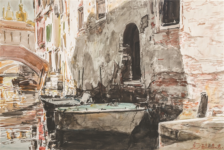 当赵云龙在天地万物间支起画架时,一切随之改变。他说,与笔法同等重要的是创作过程中的情感表达。我尤为看重写生过程中的现场性。在现场观察景物时产生的情绪反应,这种即时而生发的心理感触是难以重复和再现的。所以为了创作“威尼斯印象”系列,他先后去了5次威尼斯,每次都在岛上住很长时间,观察威尼斯24小时的“表情”;为了创作“苏州印象”系列,他多次踏入苏州园林,在那里静静地看水观亭。