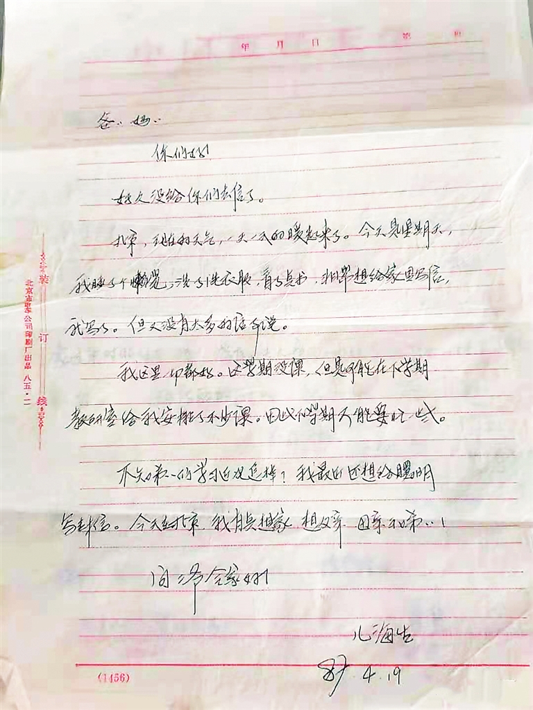 北京,现在的天气,一天一天暖起来了。今天是星期天,我睡了个懒觉,洗了洗衣服,看了点书,非常想给家里写信,就写了。但又没有太多的话要说。