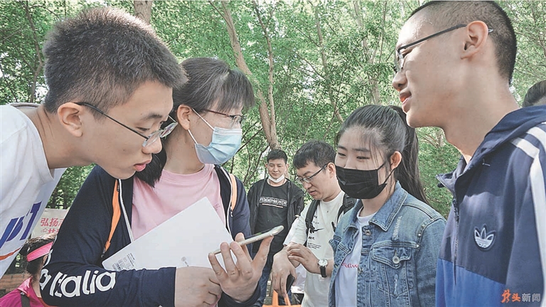 8日高考第二天,记者在哈尔滨师范大学附属中学考点外看到,老师们纷纷走到自己的学生身旁,或是一对一或是一对多,反复强调着知识点及注意事项,耳提面命上好“最后一课”。