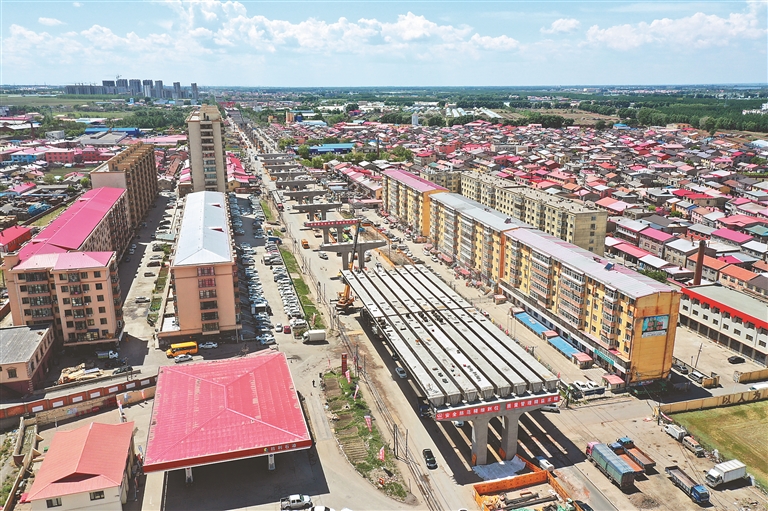 哈尔滨市道里区老机场路与天平路交口附近,机场第二通道迎宾路高架桥正在加紧建设中。