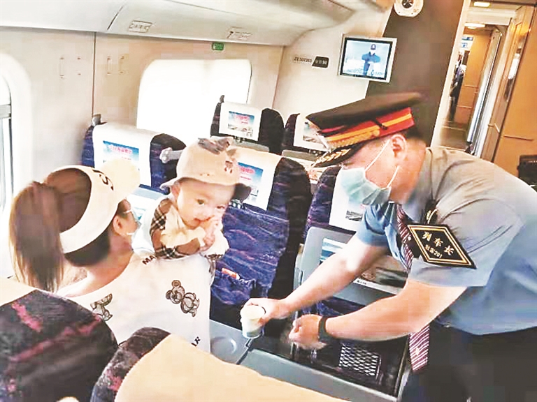 一位乘客因低血糖身体感觉不适,孔祥龙立即将自己带的早餐拿了过来,“大姐,这是牛肉馅的包子,你吃两个就好了。”刚刚安顿好这位旅客,不远处又传来一阵婴儿哭闹声,孔祥龙立即赶了过去……