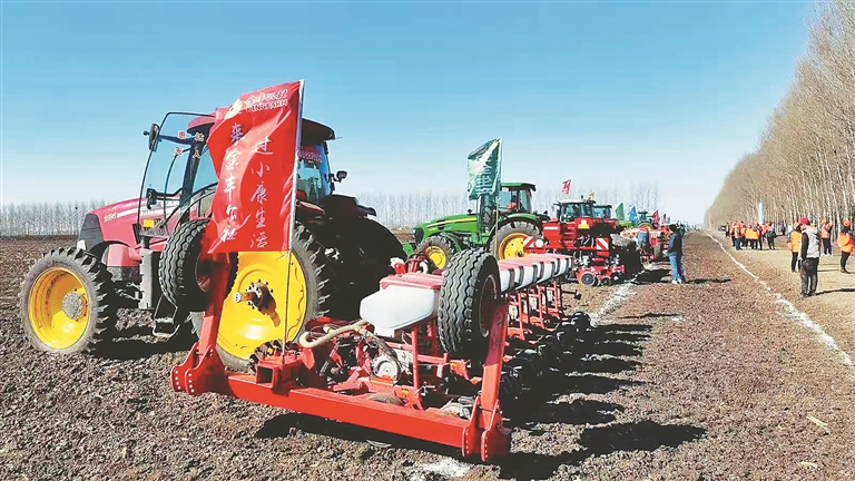 2021年绥化春播启动会现场,农机整装待发。