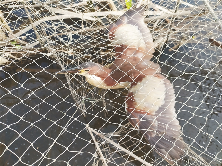 6月5日,志愿者来到哈尔滨市道里区四方台大桥附近江畔巡护,找到了多个违法设置的地笼绝户网,在清理的过程中,志愿者们看见网里面还困着一只野鸭子。原来是当地水位回落后,地笼的口露出水面,野鸭子钻进去捕鱼吃,结果困在里面出不来了,志愿者将其成功解救并放飞。