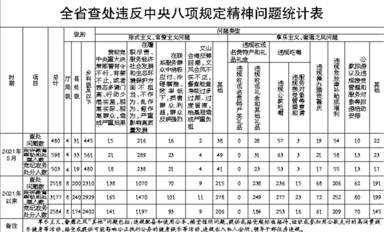 本报讯(盛季轩 黑龙江日报全媒体记者薛立伟)2021年5月,全省各级纪检监察机关共查处违反中央八项规定精神问题480起,批评教育帮助和处理598人,其中党纪政务处分503人。