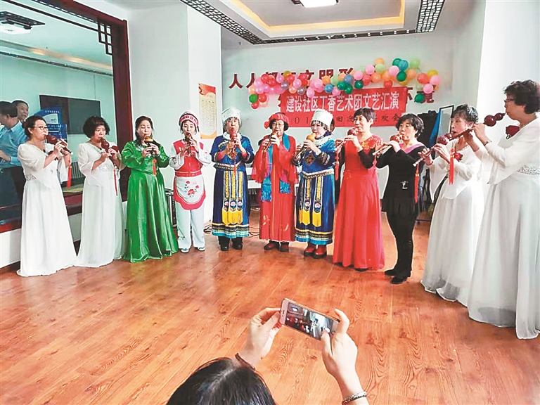 建设社区丁香艺术团的葫芦丝表演。