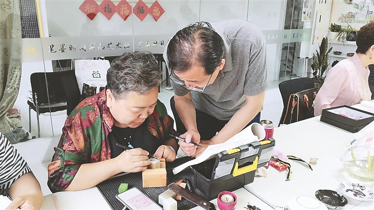 19日,记者来到“笔墨时间”,学员们正在老师的指导下研习篆刻。沙龙式的学习方式和雅居氛围,果然令人心旷神怡。
