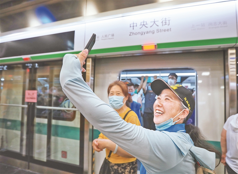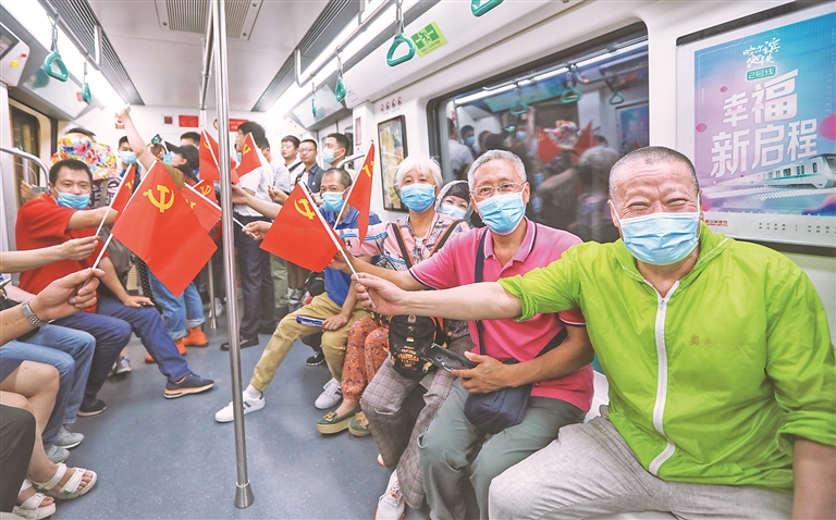 24日,哈尔滨地铁2号线试运行,千余名市民前往乘坐体验。在2号线“党员先锋号”观光专列上,有不少退休老党员坐在崭新的车厢里,挥舞着党旗,喜悦之情溢于言表。在经停的中央大街站、哈尔滨北站,市民纷纷下车,打卡拍照。