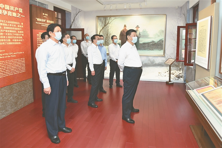 25日下午,习近平带领中央政治局同志来到北大红楼,参观“光辉伟业 红色序章——北大红楼与中国共产党早期北京革命活动主题展”,重温李大钊、陈独秀等开展革命活动、推动马克思主义在中国早期传播、酝酿和筹建中国共产党等革命历史。展厅内,一张张图片、一件件文物,全面展现了那个时期的光辉历史。习近平不时停下脚步,询问相关细节。他指出,北大是新文化运动的中心和五四运动的策源地,最早在我国传播马克思主义思想,也是我们党在北京早期革命活动的历史见证地,在建党过程中具有重要地位。要加强红色资源保护和利用,尊重历史事实,准确评价历史,正确学史用史。