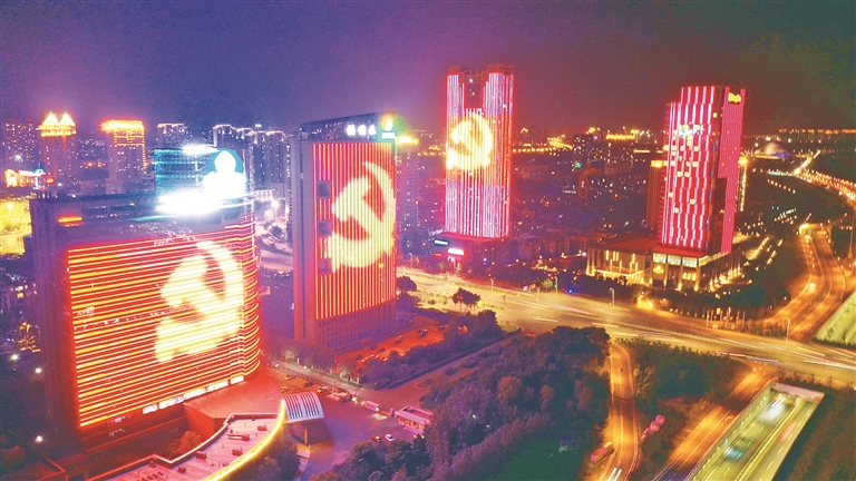为庆祝中国共产党成立100周年,哈尔滨市松花江沿岸数个高楼大厦上以“点亮冰城共庆华诞”为主题的灯光秀,点亮夜空,流光溢彩。