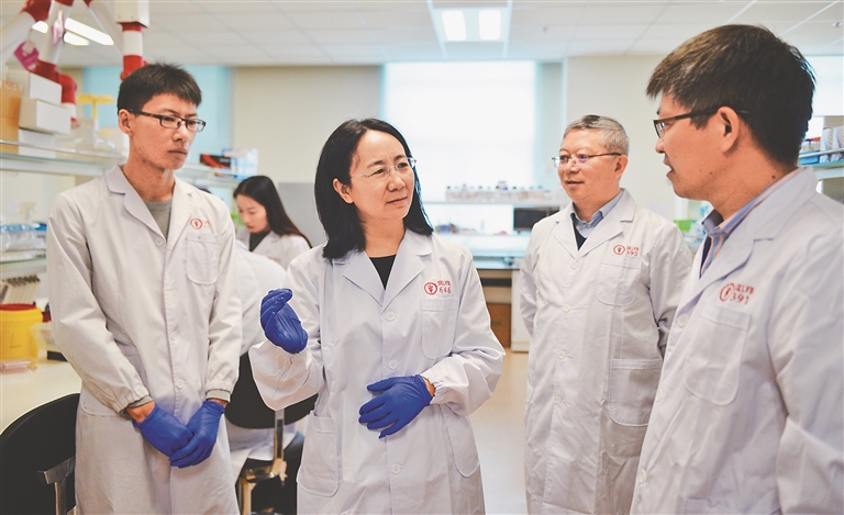 陈化兰院士(左二)指导团队科研人员做研究。黑龙江日报全媒体记者 邵国良摄