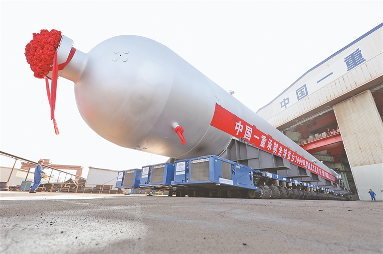 中国一重承制的全球首台3025吨级浆态床锻焊加氢反应器在大连完工发运。