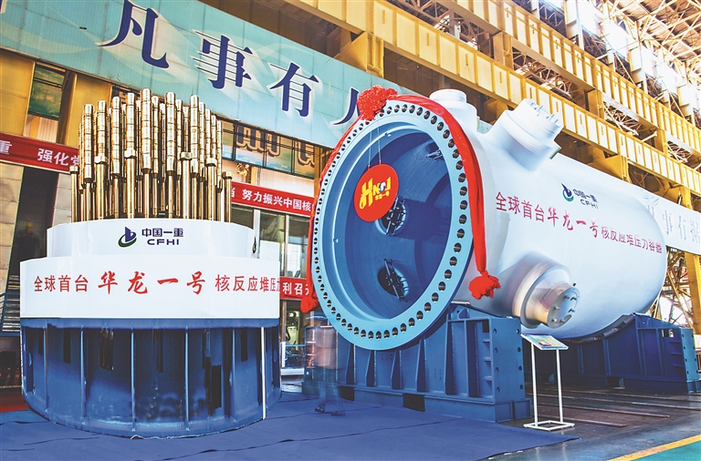 中国一重全球首台“华龙一号”核反应堆压力容器。