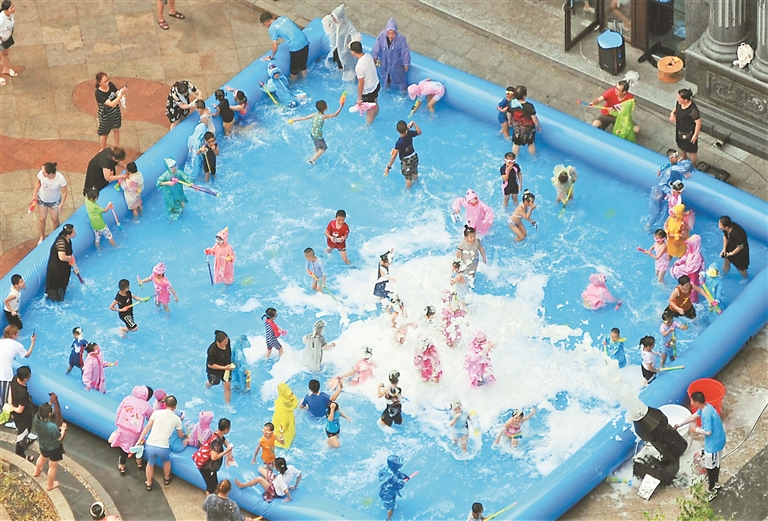 24日,哈尔滨市最高温达到了34°C,人们想方设法避暑降温。当天,道里区工农大街附近一个居民小区里搬来了“儿童水上乐园”,为炎热夏日里的孩子们提供了一个凉爽的活动场地。在近百平方米的大水池内, 孩子们有的打水仗,有的玩泡泡,一些家长们也参与其中,欢笑声、叫喊声不绝于耳,大家都玩得非常尽兴,也享受到酷暑里少有的清凉。