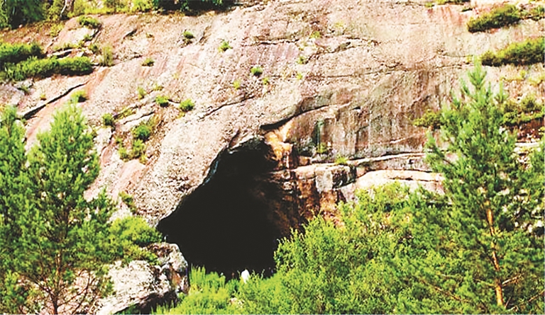 前面出现一座岩石裸露、林木稀少的大山,与这一带其它茂密的山谷相比,这座花岗岩山显得与众不同。山腰上一个坐北朝南、略呈三角形的黑黝黝的洞口映入眼帘。透过洞下秀丽、婆娑的绿树望去,洞吐溥雾,山绕白云,犹如仙境一般。