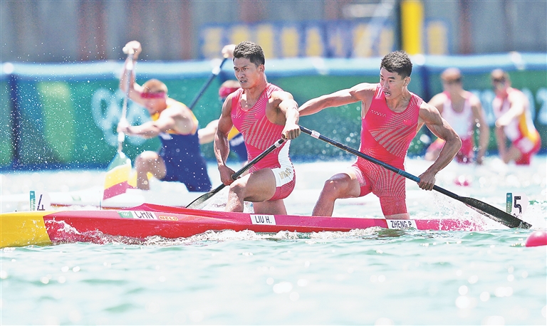 3日,刘浩(前)/郑鹏飞在皮划艇静水男子1000米双人划艇决赛中,获得亚军。