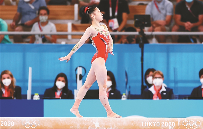 3日,在体操女子平衡木决赛中,管晨辰夺得冠军,唐茜靖获得亚军。图为管晨辰在比赛中。