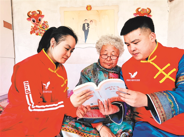 齐齐哈尔市梅里斯区组建石榴籽宣讲团,用双语(达斡尔语、汉语)宣讲党史。在莽格吐村多玉华老人家中,志愿者用达斡尔语给老人讲述党史故事和当地巨大的生活变化,老人听完宣讲后激动地说:“咱们的党真伟大!”