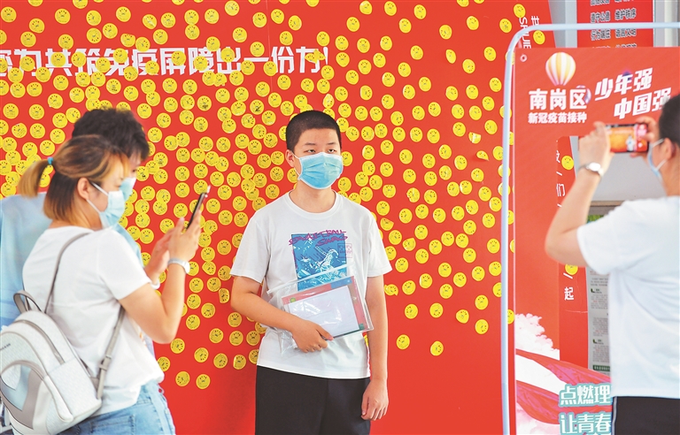 在出口的一处区域,黄澄澄的笑脸贴纸覆盖了一整面展板,展板旁有拍照相框,“为了增加学生接种成功的荣誉感,我们设置了接种纪念区,从身上揭下贴纸贴到展板上、选择自己喜欢的元素相框拍张照……简单的操作让孩子们犹如完成一项任务般仪式感满满。”派驻接种点辅助完成接种任务的南岗区教育局校外教育活动中心主任李月晖,一一鼓励道“孩子们,好样的!”不仅如此,在留观室,电视里分别播放着奥运会比赛和建党百年宣传片,在讲台上有糖果,可为学生和家长及时补充糖分,还有脑筋急转弯单页,让学生和家长度过一段难忘的亲子时光……“作为学生,抗‘疫’帮不上什么忙,主动接种疫苗算是为国家群体免疫尽一份绵薄之力吧。”虹桥中学黄河路校部初三学生刘厶芮高兴地说。